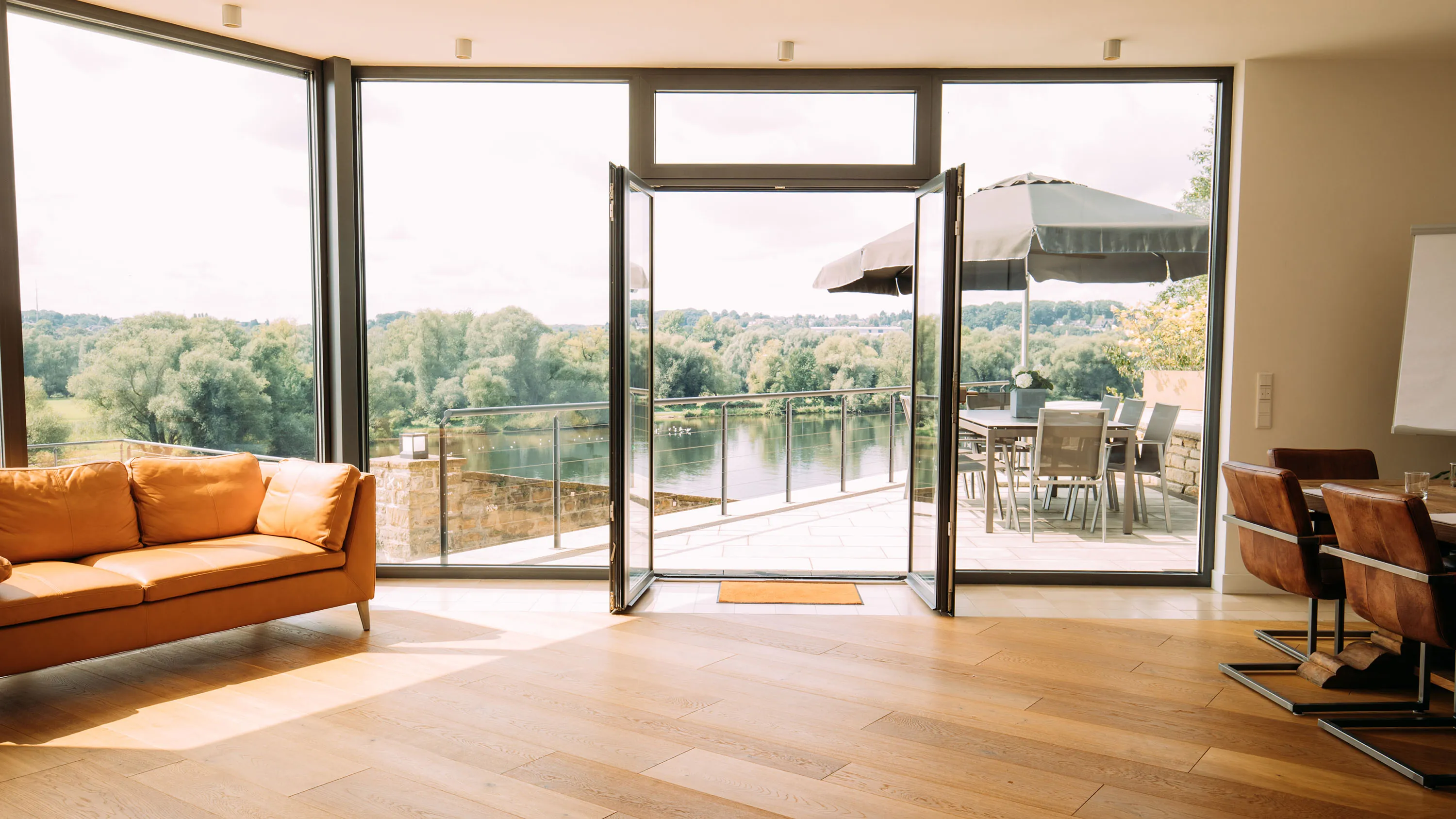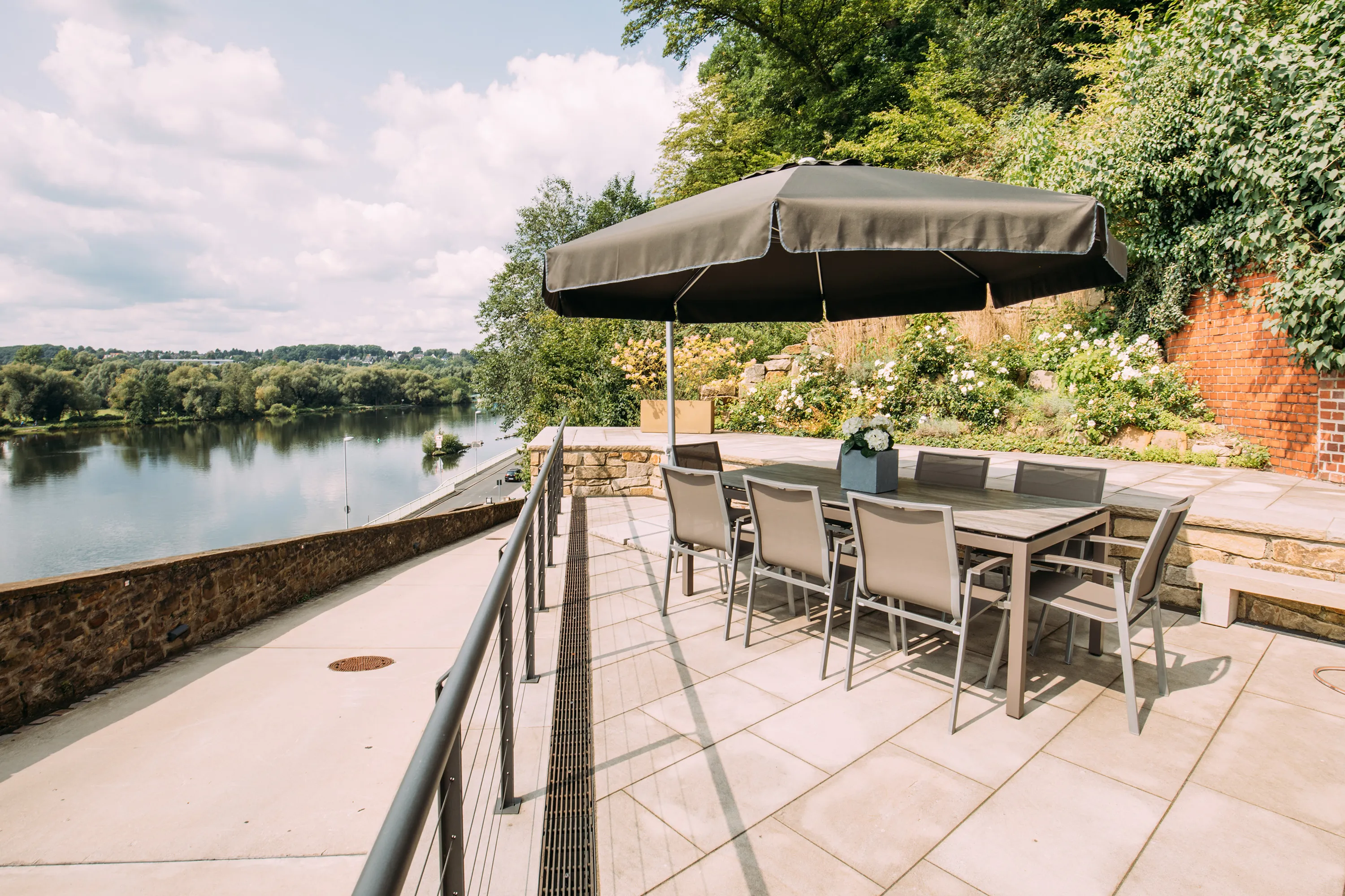 Der lichtdurchflutete Trainingsraum bietet modernste Technik und flexible Gestaltungsmöglichkeiten. Die großzügige Terrasse und der Außenbereich laden zu inspirierenden Pausen ein – optional mit Catering oder Grillen in entspannter Atmosphäre.